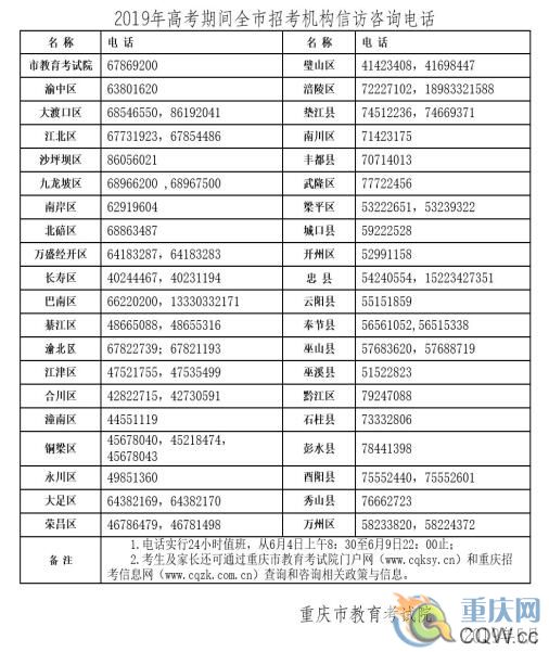 重慶市2019年全國普通高考將于6月7日-8日進行,為了進一步暢通信訪咨詢渠道,切實維護好考生利益,做到考試招生公平、公正,現將全市招生考試機構在高考期間信訪咨詢電話及工作時間公布如下: