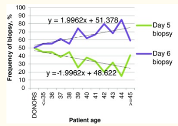 - 在一組≥45歲的女性中,85.1%的胚胎活檢延遲到了第6天進行活檢,從圖上的趨勢圖可以明顯發現,隨著孕婦年齡的增長,這一比例逐漸改變,大多數胚胎變成了在第6天進行活檢。