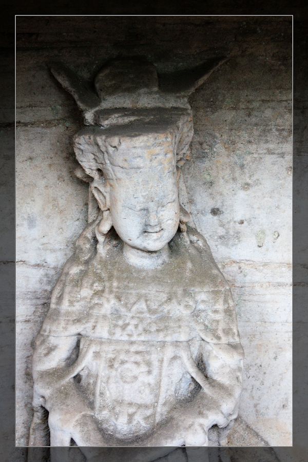北山沒有碰到別的游客倒也愜意。這里的雕塑近乎佛龕,外面還覆蓋了人工長廊,大若居室,小的不過十幾厘米見方。雖然不乏精細之作,但大多粗陋且破損嚴重。由于沒有導游,更是來也匆匆去也匆匆。回去的時候沒找到出租車,擠在一輛摩托車上下了山,略有驚險。