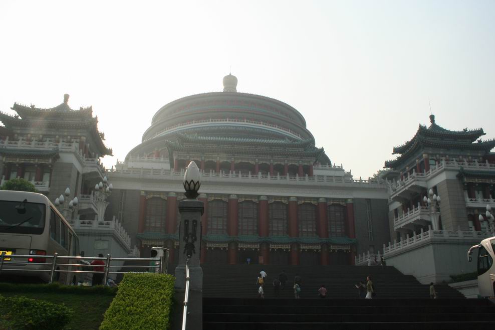 下一個景點是重慶人民大會堂,它位于人民路學田灣,是重慶市最大的劇場,和新修建的三峽博物館遙相對望。1950年動工興建,1953年竣工。初名中蘇大樓,后改名為西南行政委員會大禮堂,1955年改現名。大禮堂占地6.6萬平方米,建筑面積2.5萬平方米,分禮堂、南樓和北樓三部分。其中禮堂占地1.85萬平方米,禮堂高65。大廳高55,內徑46.33。正廳內設大型舞臺一座,四周環繞五層挑樓,四樓一底共4206個座位。