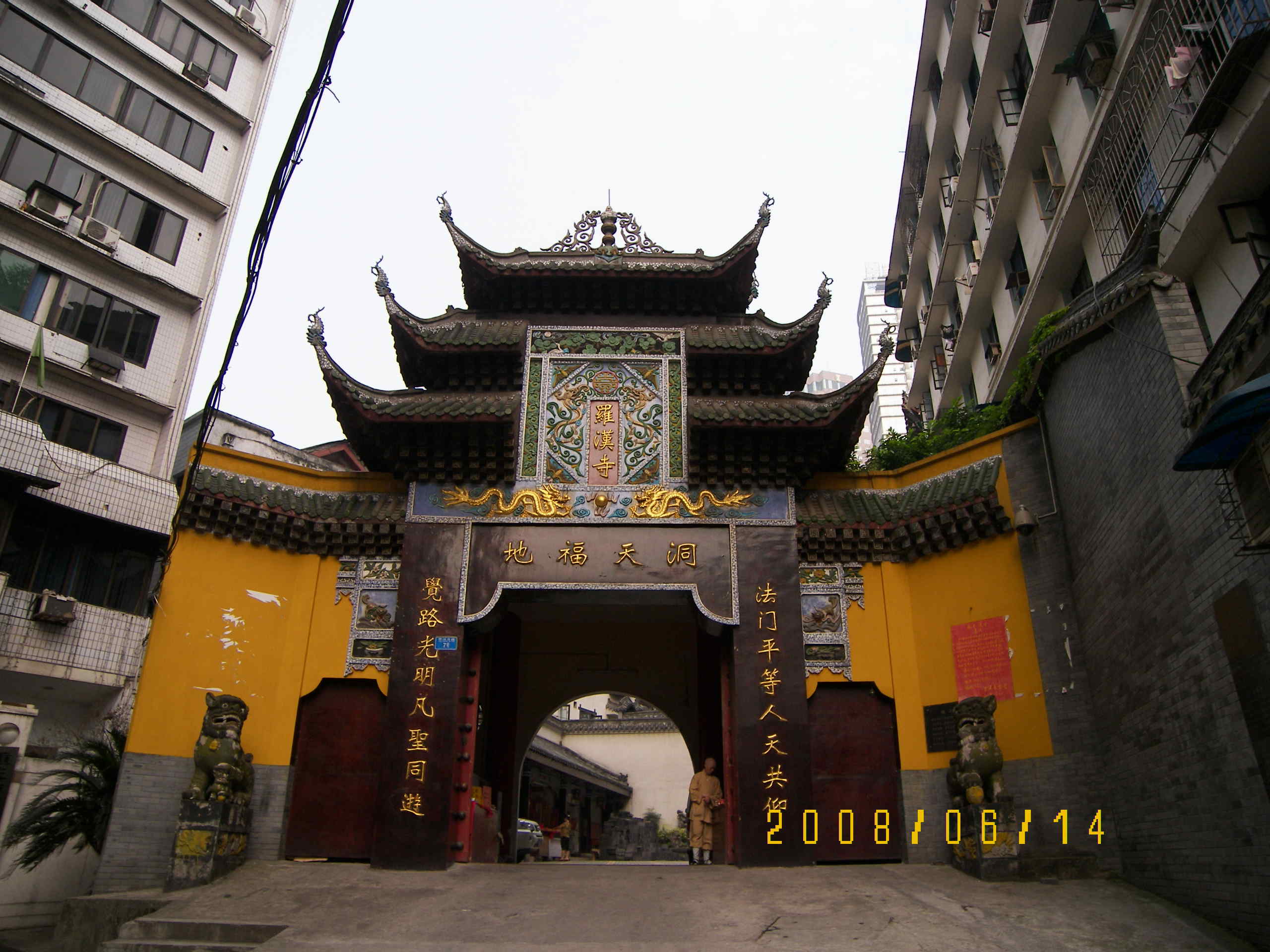 退房后約7:45出門,沿朝天門隧道旁的東正街上行,經(jīng)第一步道、民族路來到羅漢寺,路口就看到了"警安消防器材公司"的牌子,門票10元.羅漢寺因<<瘋狂的石頭>>而名聲大噪,差不多到重慶都要區(qū)看看,其實它本身的歷史也不短. 它始建于北宋治平年間(1064-1067年),原名治平寺。清乾隆十七年(1752年),因前殿坍圯,改建龍神祠。后又稱羅漢寺、古佛巖。清光緒十一年(1885年),隆法和尚重修廟宇,并仿新都寶光寺建羅漢堂,泥塑五百阿羅漢,方改名羅漢寺。進(jìn)去的時候憑票領(lǐng)取香3支,蠟燭1對.地方不是很大,五百阿羅漢堂在整修,據(jù)工人師傅說要明年才能完工.古佛崖石刻蠻漂亮,可惜不能拍照.其實石頭有很多場景是在別處拍的,燒過香,拜過諸位佛爺菩薩保佑自己和親朋好友平安后,看過大雄寶殿和藏經(jīng)閣,從羅漢寺后門的五一巷出去,又走到了解放碑,找到吳抄手也就找到了能仁寺.能仁寺(免費參觀)原名三教堂,早期名海云寺,也有三百年的歷史了.山門牌樓上的住持題字并未發(fā)現(xiàn),據(jù)說原來還有一個老的牌樓,估計在那里.地方不大,大雄寶殿和鐘樓、鼓樓看完,從側(cè)面走出去得意世界.