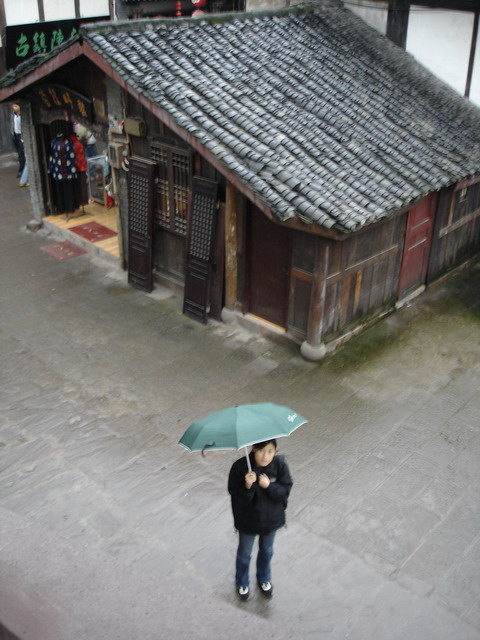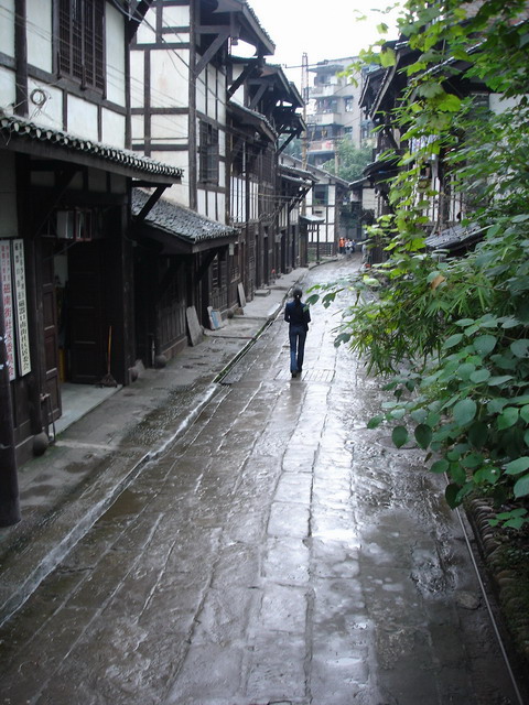 酒足飯飽,雨也稍微停了,我們坐著“小公共”沒用多久到了瓷器口(千年古鎮)。剛一到,小毛毛雨又飄下來了,別管它,我們徑直進了鎮子。不大,整個街道呈“T”字形,潮濕反光的石板路,深色木頭門,或真或假的手工作坊,做各種買賣的小門臉兒。。。。。。到這種地方買東西是不明智的,而且很“棒槌”。我們呢,當然是瘋狂照相。喧囂的小鎮麻將館,游人罕至的街道盡頭,地下黨當年接頭兒的雜貨鋪,小鎮居民自己的菜市場,這些都一一被精心收藏在我們的鏡頭里。我們還有其他收獲,離開瓷器口之前,我們從一個挑著擔子的年邁老人那里買了三個竹子炊杵。 講到這里我要說一個事兒了,不知道其他人是否一樣,我是在來重慶之后才從她嘴里直到“棒棒”的,他們是重慶靠出賣自己的體力謀生存的一群人,他們生活在城市的邊緣、現代化的底層,是與現今這座時髦的省會城市格格不入的一群人,在我眼中卻又是和這城市的命運牢牢拴在一起的一群人。他們手里總是握著木棒,沒活兒的時候,三五成群的站在路旁,有人雇他們,他們就用木棒替客人扛重物,這樣的山城,路很不好走,有人又懶又有錢,他們就有了生計。我在想,上百年前的川渝地區就已經有他們的足跡了吧,山城重慶,該不會就是這樣的人扛出來的。沒查閱過任何資料,我對他們的了解也僅限于這次重慶之行。他們使重慶區別于其他任何地方,真實的一個重慶出現了,此時的城市不再朦朧,很具體的站在我的面前,滿臉滄桑,雙手粗糙,肩膀有力地扛著很粗的木棍或是竹竿。我們從一位年邁的“棒棒”那里買了些東西,我們“棒槌”么?
