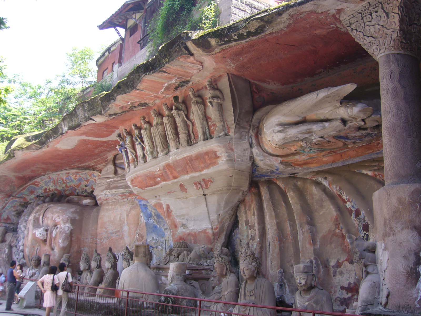 寶頂山的主要景區是大佛灣。景區的規模、石刻的數量不如我所到過的龍門石窟與云岡石窟,但是雕像的精美毫不遜色,也因為形成年代晚于龍門和云岡,保存得比較完整。與眾不同的是,這里的石刻題材很有兼容性,佛、道共存,也有百姓生活化的內容。進門不遠,兩尊石像“道祖乘牛登岸上,