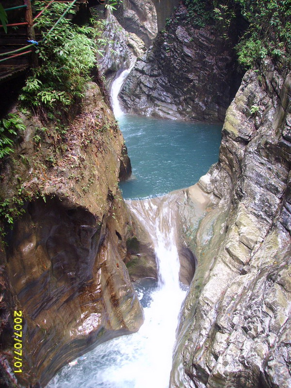 整個上峽都是在溪水邊穿行,美不勝收.中/下峽前有燒烤,應該不錯,一般走到這里也差不多快吃飯了,可以好好補充一下,之后開始中下峽之旅.中下峽基本上是在澗水上方的棧道上.由于巖石滴水,很濕滑,去的朋友一定要注意,鞋一定要輕巧防滑的.還有,棧道好多地方很窄,我這樣的很不容易過,體重過二百斤的朋友最好不要去,,呵呵.