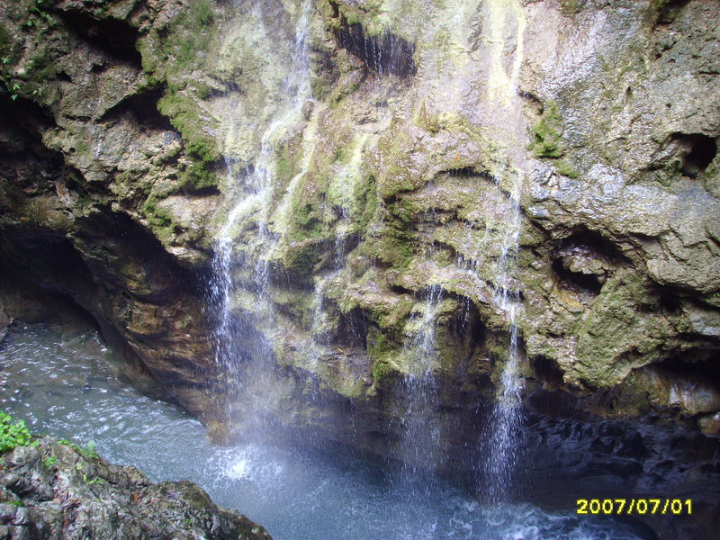 第二天,早上一定要早走,好像金刀峽早七點以前不要門票.我們到那剛剛七點過...:(.一路走來,要走全程應該是九公里,走近路是六公里,我們走了全程的路,路邊有些犀牛洞,仙女洞什么的,都是個人承包開發的,我們走到洞口看看也就是溶洞,就沒進去,此路先是一路上升,風景也不錯,漫漫山路,直到藏刀洞.開始折入峽谷,延峽谷開始了真正的行程.