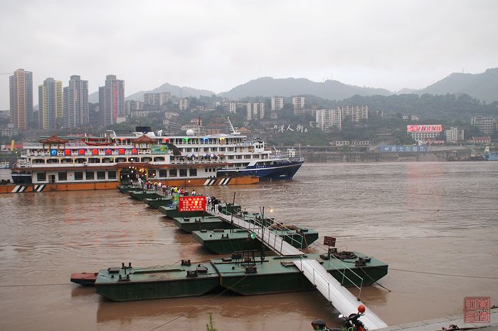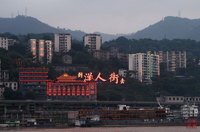 在馬路邊的大排檔簡單地吃了點東西,上船,岸邊有賣各種小吃的小販,還有背著掛滿氣球的架子跑來跑去的生意人,“滿江紅”號,共三層,二層是飯店,三層是觀景平臺,有人在包間里杯來酒往,絲毫不顧忌窗外探視的目光,燈光慢慢地亮了起來,8點,船開了,先是嘉陵江,過去這條江水是清的,與長江會合時的分界線很明顯,當地人說“同流不合污”,后來也渾了起來,看不出區別。從朝天門開始,逆水而上,岸上的燈光很是耀眼,有射燈掃來掃去變化著看到的景物,遠處的大橋晶瑩透明,據說是用了最先進的反光材料,確實很漂亮。