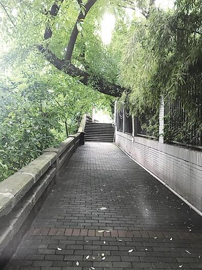 由于地形因素,步道沿著嘉陵橋東村的山腰往嘉陵江方向延伸。記者是第一次走進嘉陵橋東村,沒想到嘉陵橋橋頭的山堡上還有不少居民戶。初入步道,長著青苔的石板一看就有些年月了,但是步道還比較寬敞。步道旁的樹,枝繁葉茂,冠蓋如傘,初夏的綠蔭把步道裝點成了“空中綠廊”。