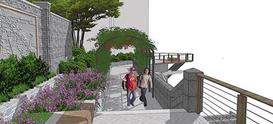 記者了解到,步道項目設計分成了4個功能分區,包括渝中印象、山城故事、臨崖掠影和山梯拾憶,其中有展示嘉陵橋東村歷史的門樓、觀景陽臺、老院廣場、山城游園等。值得一提的是,步道在人民小學后的居民樓旁將新建100余米懸空棧道,將步道真正貫通,形成大環線。相關負責人表示,懸空棧道緊鄰居民樓,加上棧道下是嘉濱路,這對施工來說是一個不小的考驗。記者從效果圖上看到,懸空棧道中部還將建旋轉樓梯與嘉濱路相連,以后游客就可以直達嘉濱路。