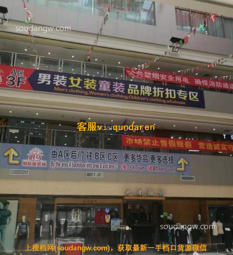 銀馬可以分為三個區A、B、C 三個區,其貨品層次很簡單明了,幾乎所有一樓的檔口都是男裝零售批發商,主做外國生意,很多非洲黑人來這邊訂貨,樓上就幾乎全都是品牌女裝折扣批發公司。不僅只有銀馬有,銀馬附近及錦東、慶豐、廣大,這些地方都分布著大大小小的品牌折扣公司,夠你逛兩三天的了。其品牌有來自全國各地的品牌,應有盡有。 來這拿貨的朋友可以帶上你的男伴,這里各種款型的男裝都有零售,而且價格也很有優勢,就算你不是批回去賣,多個十來塊錢買幾件回去給你的親人穿,都是很合適的。