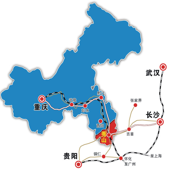 區位獨特,交通便利。秀山地處武陵山腹地,位于渝、湘、黔、鄂四省(市)邊區結合部,是重慶市東南門戶,武陵山區重要的旅游集散地和物資集散地,成渝經濟圈連接“珠三角”和“長三角”的重要通道。周邊有3個機場(銅仁鳳凰機場、黔江武陵山機場、張家界荷花國際機場),距離80—180公里。境內渝懷鐵路、秀松高速縱貫南北,渝湘高速橫穿東西,國道319線、326線在縣城交匯,渝懷鐵路二線即將開通,渝湘高鐵動工建設。